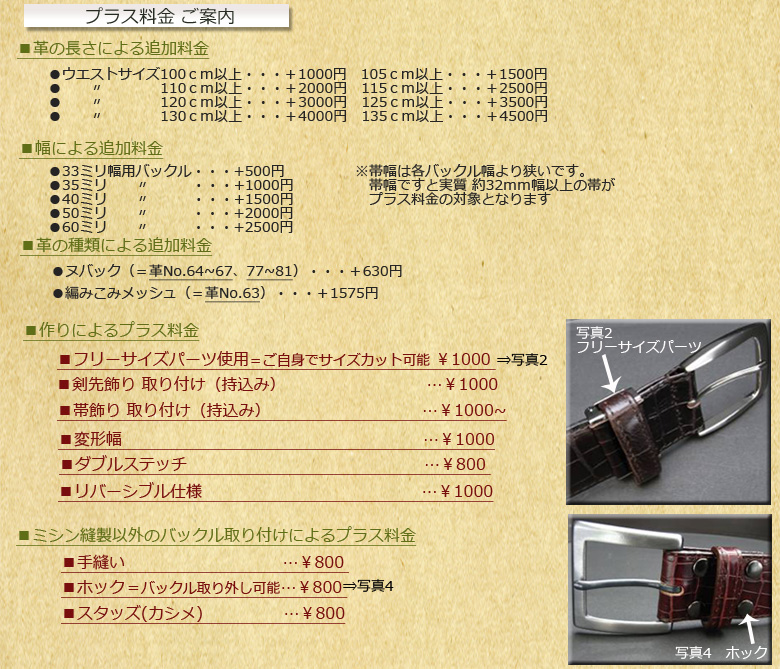 バックルと革を組み合わせて注文フォームから即オーダー!約2週間で納品!⇒制作例はこちら ・選べるバックル:約100種類 革:約130種類 ・ウエスト100cm以上、リバーシブル・ダブルステッチなど仕様に応じて一部プラス料金をお願いしております(下の「プラス料金ご案内」参照) ・2本以上のご注文で送料無料(同梱・同一送付先でしたら、ご家族やご友人の分などサイズが違うものでもOK!詳細はこちら) |