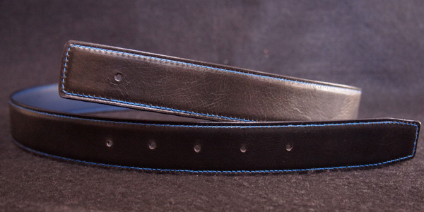 粗シボの型押し黒 リバーシブルの場合、 コバ(革の断面)は両面の革の中間色で染めます 革が黒とキャメルなので コバは焦げ茶 |