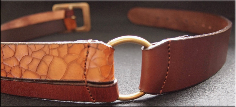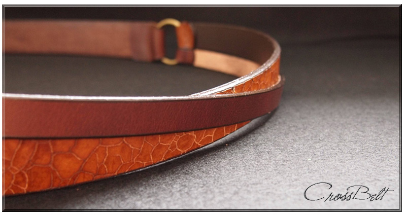 無地の1枚革(オイルレザー)とクロスさせる革は、ヒビ割れ加工の革。異素材の革でメリハリを付けています。 クロス部分は無地の革を下にして飽きのこないデザインにしました。 |