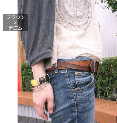 グレーのハーフパンツに。 ブラックとブラウンのベーシック カラーのベルトなので、トップスのパープルとも合います。 |