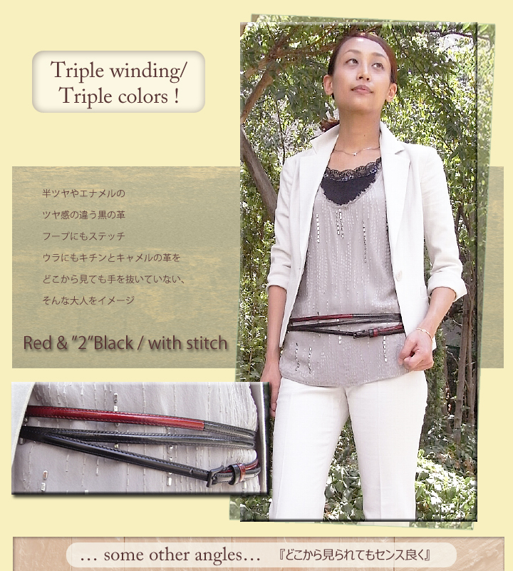 | エナメルの赤という、主張する素材・色を 大人っぽく品よく仕上げたいと思い製作 幅を狭くすることにより程よい仕上がりになった ものの、今度はやや主張に欠sけた感があったので 別の色を入れつつ3連にしてみました 丁度良いバランスの色合いに仕上がりました ちょっぴりドレッシーなベルトです パーティーシーンやお仕事スタイル 普段使いまで、幅広くコーディネートできます |